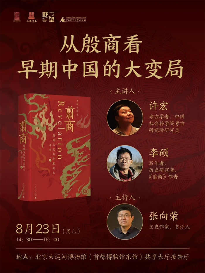 本期讲座特别邀请到两位深耕中国上古史与考古学领域的顶尖学者——考古学家许宏与历史学家李硕,引领大家回溯这一至关重要的文明奠基期。李硕老师的著作《翦商》便是书写中国上古时代的文明起源内容,始自新石器时代末期(4000余年前),止于商周易代(殷周革命),许宏老师认为这本书将宏大叙事与细微史料结合,既能从全局上概览,又能从细节处发现真知灼见。
