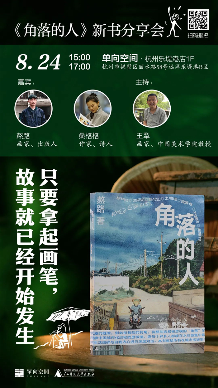 8月24日(周日)15:00—17:00 ,熬路携新书《角落的人》与作家桑格格、画家王犁来到单向空间·杭州乐堤港店,在探索“附近 500 米”的实践轨迹中,揭秘水彩笔下的老街巷陌如何成为都市人的精神自留地——正如书中所写:“只要拿起画笔,故事就已经开始发生。”