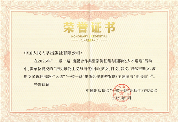 2025年8月16日,由中国出版协会、中国出版集团有限公司主办的第六届“一带一路”出版合作经验交流会在广州成功举办。会上,第六届“一带一路”出版合作典型案例征集与国际化人才遴选活动结果予以公布,中国人民大学出版社荣获三项荣誉:“《历史唯物主义与当代中国》多语种图书出版”入选“‘一带一路’出版合作典型案例(主题图书‘走出去’)”;总经理李开龙入选“‘一带一路’国际化领军人才”、国际合作部主任刘光宇入选“国际化人才”。中国人民大学出版社已连续6届在该评选活动中获奖。
