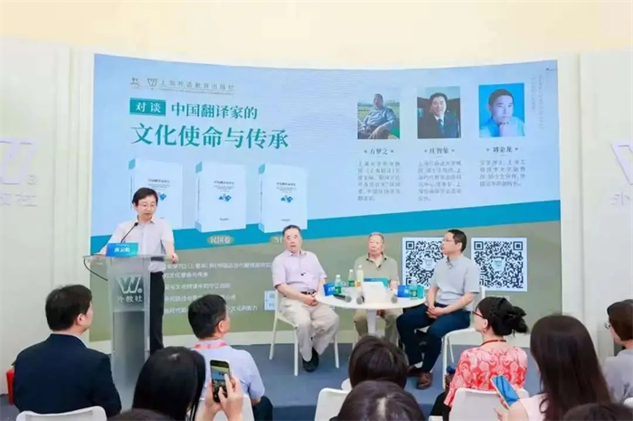 8月15日上午,上海外语教育出版社特邀中国出版政府奖图书奖提名奖、上海市图书奖特等奖获奖图书《中国翻译家研究》(三卷本)主编——“翻译文化终身成就奖”获得者方梦之教授、上海市编辑学会名誉会长庄智象教授来到书展现场,与上海工程技术大学外国语学院副院长刘金龙副教授进行了精彩对谈。