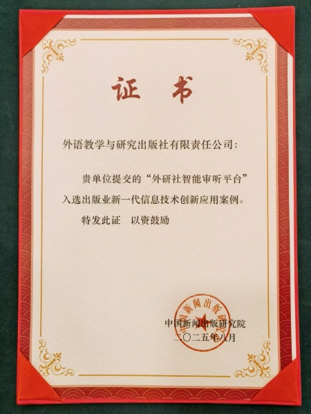 会上,由中国新闻出版研究院组织的“出版业务新一代信息技术创新应用案例”活动宣布入选结果。外语教学与研究出版社(简称“外研社”)报送的“外研社智能审听平台”成功入选。
