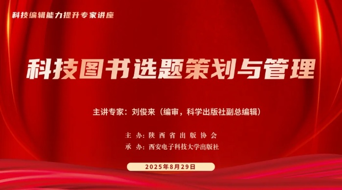 8月29日上午,为赋能陕西科技出版高质量发展,由陕西省出版协会主办、西安电子科技大学出版社承办的全国新闻出版行业领军人才、科学出版社副总编辑刘俊来编审专家报告会在西安电子科技大学出版社举办。全省14家出版社的领导、编辑共100余人参加报告会。