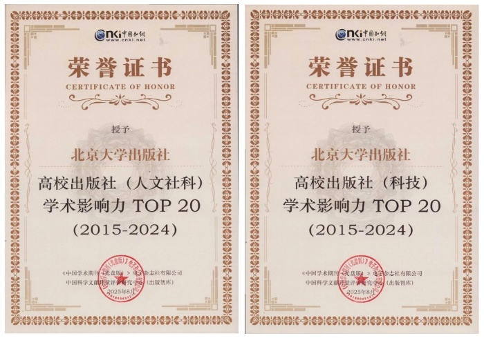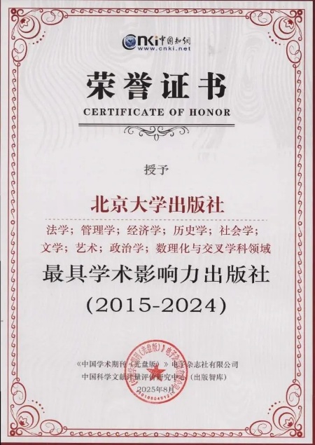 北京大学出版社在法学、管理学、经济学、历史学、社会学、文学、艺术、政治学、数理化与交叉学科9个学科领域获评最具学术影响力出版社(2015-2024)。