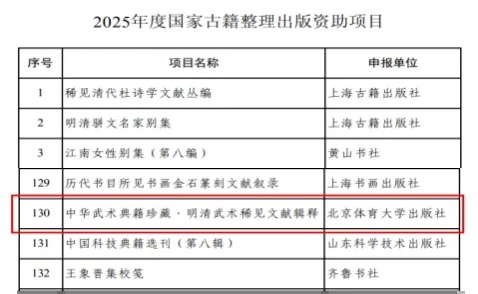 近日,全国古籍整理出版规划领导小组办公室公布了2025年度国家古籍整理出版资助项目,北京体育大学出版社申报的《中华武术典籍珍藏·明清武术稀见文献辑释》成功入选,这是继《中华武术典籍珍藏·中国武术研究院院藏清抄本校释》之后,北京体育大学出版社图书再度获得国家古籍整理出版专项经费资助,体现了北京体育大学出版社在体育文献整理出版领域的持续深耕与专业实力。