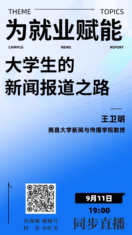 9月11日(星期四)19:00,南昌大学新闻与传播学院教授王卫明担任主讲人,为大家带来讲座——为就业赋能:大学生的新闻报道之路,与观众一同分享校园新闻报道的实战技巧。