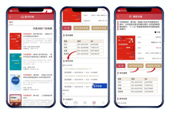 登录“中国人民大学出版社”官网,检索您需要的样书,进入样书页面,点击电子书申请即可免费获取,页面教学资源栏目,免费下载各种课件资源(如示例)