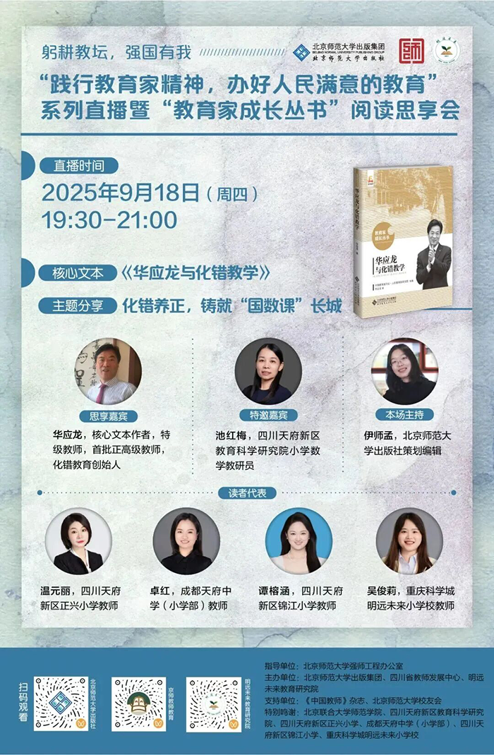 教育是国之大计、党之大计,教师是立教之本、兴教之源。为深入贯彻落实习近平总书记关于弘扬教育家精神的重要指示,响应教育部“教育家精神万里行”活动,在北京师范大学强师工作办公室的指导下,在北京师范大学校友会和《中国教师》杂志的支持下,北京师范大学出版集团携手四川省教师发展中心、明远未来教育研究院,重磅推出“践行教育家精神,办好人民满意的教育”线上直播暨“教育家成长丛书”阅读思享会。