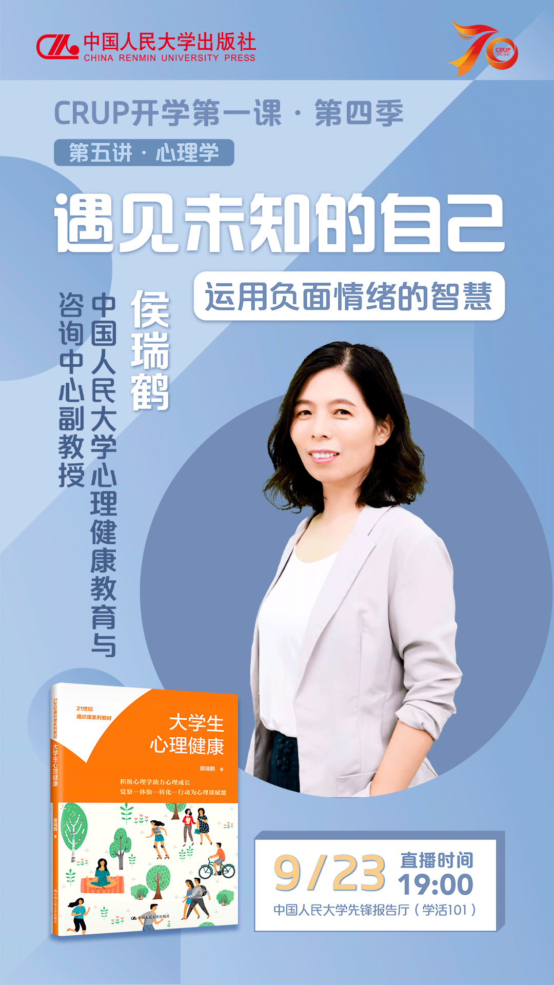 “CRUP开学第一课”是人大出版社每年9月面向大学生的综合活动策划,已成功开展三季,影响近千万学生,又是一年开学季,CRUP开学第一课·第四季再邀宝藏名师,为大学生讲授开学第一课,第五场心理学,9月23日晚开启,欢迎通过线上线下参与活动。