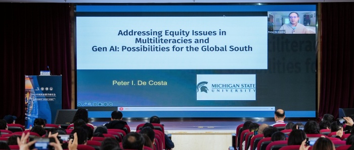 美国密歇根州立大学Peter I. De Costa教授作了题为“Addressing Equity Issues in Multiliteracies and GenAI: Possibilities for the Global South”的报告。De Costa提出,生成式人工智能(GenAI)背景下,批判性数字素养是师生需要培养的核心能力,并结合两项研究,深入探讨了情感、身份认同、意识形态和权力关系与教育教学实践之间的紧密联系。同时,他提醒关注GenAI可能带来的刻板印象等伦理风险及其可能加剧全球北方与全球南方之间的鸿沟。最后,他从基于特定平台的素养与身份认同、口音偏见、批判性数字素养课程设计等四个方面展望未来研究议题,并呼吁教师协力开展研究,共同推动教育公平。