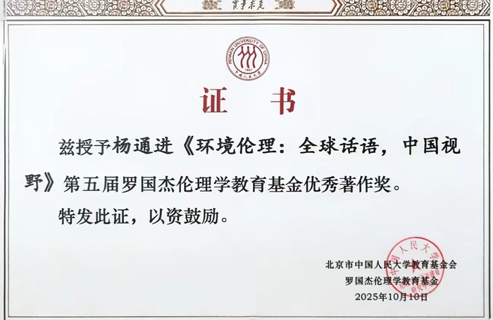 《环境伦理:全球话语,中国视野》系统梳理环境伦理学主要流派,创新提出整合东西方智慧的“四种境界”说,并深入挖掘中国传统文化中的生态智慧,致力于构建一种既能与全球环境话语对话,又具有鲜明中国气派的环境伦理学体系。该书的出版打破了环境伦理学领域长期由西方话语主导的格局,为全球环境危机提供理论方案与中国视野,同时也为我国生态文明建设的实践提供了深厚的理论支撑与道德资源,对推动生态文明的学术创新与实践发展具有重要价值。这一权威奖项是对杨通进教授个人学术成就的高度认可。