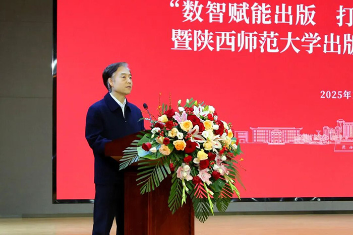 陕西师范大学校长游旭群致辞。他谈到总社40年风雨兼程的成长史,是一部与改革开放同频共振的奋斗史,是一部服务国家科教兴国与教育强国、文化传承创新与文化强国建设的奉献史,也是一部与学校休戚与共、相得益彰的发展史。总社始终坚持正确出版导向,坚守文化责任,深化改革创新,影响力、竞争力和服务能力持续提升,走出了一条独具特色的大学出版之路。希望总社以40年社庆为契机,承前启后,继往开来,植根博大精深的中华文明,顺应信息技术发展潮流,深刻把握数智时代的历史机遇,自觉担当新的文化使命,在坚守中创新,在融合中发展,更好服务文化强国、教育强国建设。