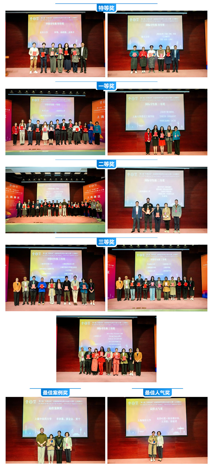 赛事启动以来,上海市内各高校积极响应,精心备赛。在案例展析环节,选手们表现优异,围绕多元文化生活、公共外交、商务沟通开发具有独创性的跨文化交际案例,紧扣当下热门话题与时代特色,充分展现了新时代大学生们独到的视角和创新意识。