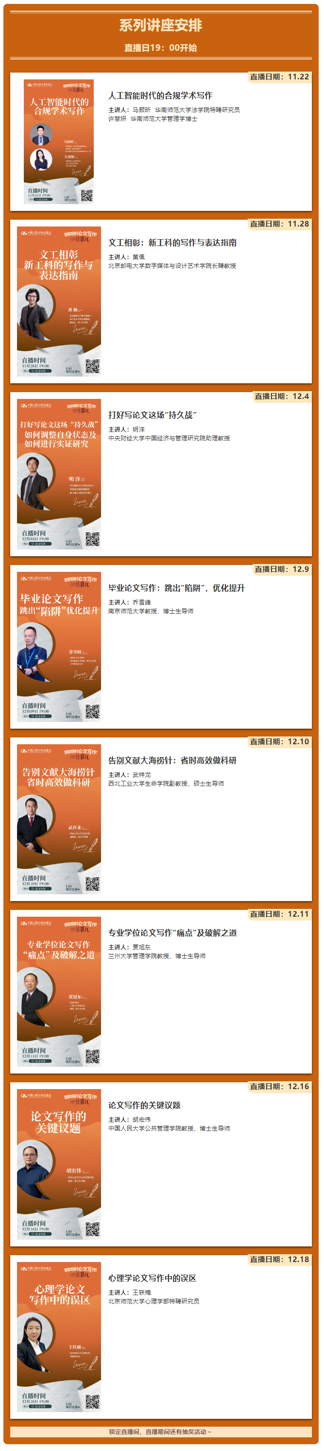 别担心,中国人民大学出版社“聊聊论文写作那些事儿”系列讲座重磅来袭,集结了多位深耕学术写作领域的作者,聚焦论文写作中最核心、最棘手的各个环节,提供体系化、可落地的方法技巧,少走弯路、高效搞定论文,摆脱写作焦虑。