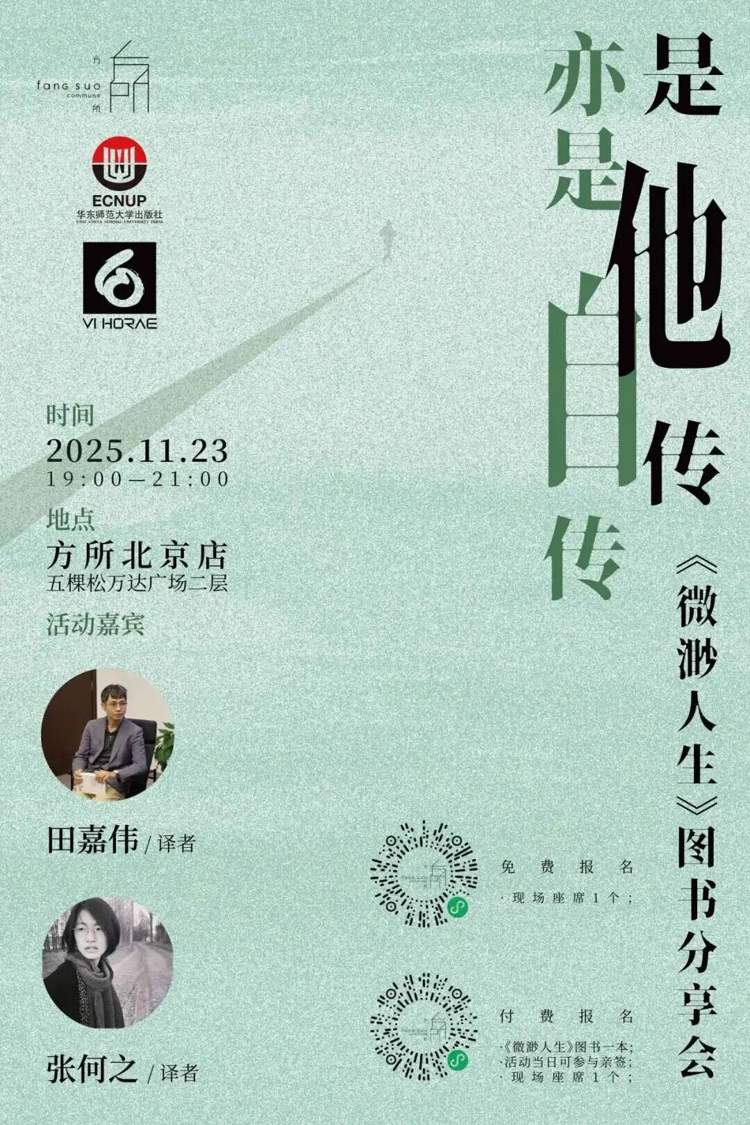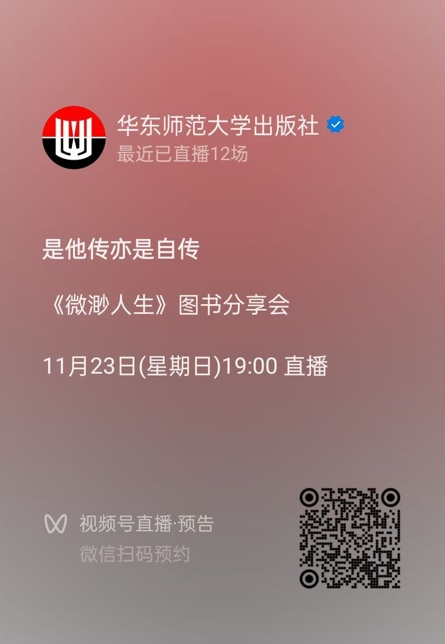 11月23日(周日)19:00-21:00,方所北京店联合华东师范大学出版社,邀您和《微渺人生》译者田嘉伟、译者张何之和华东师范大学出版社编辑卢荻一起,走进这场关于生命叙事的对话。