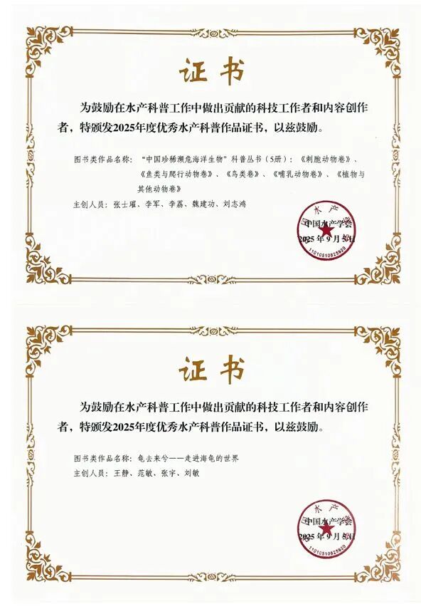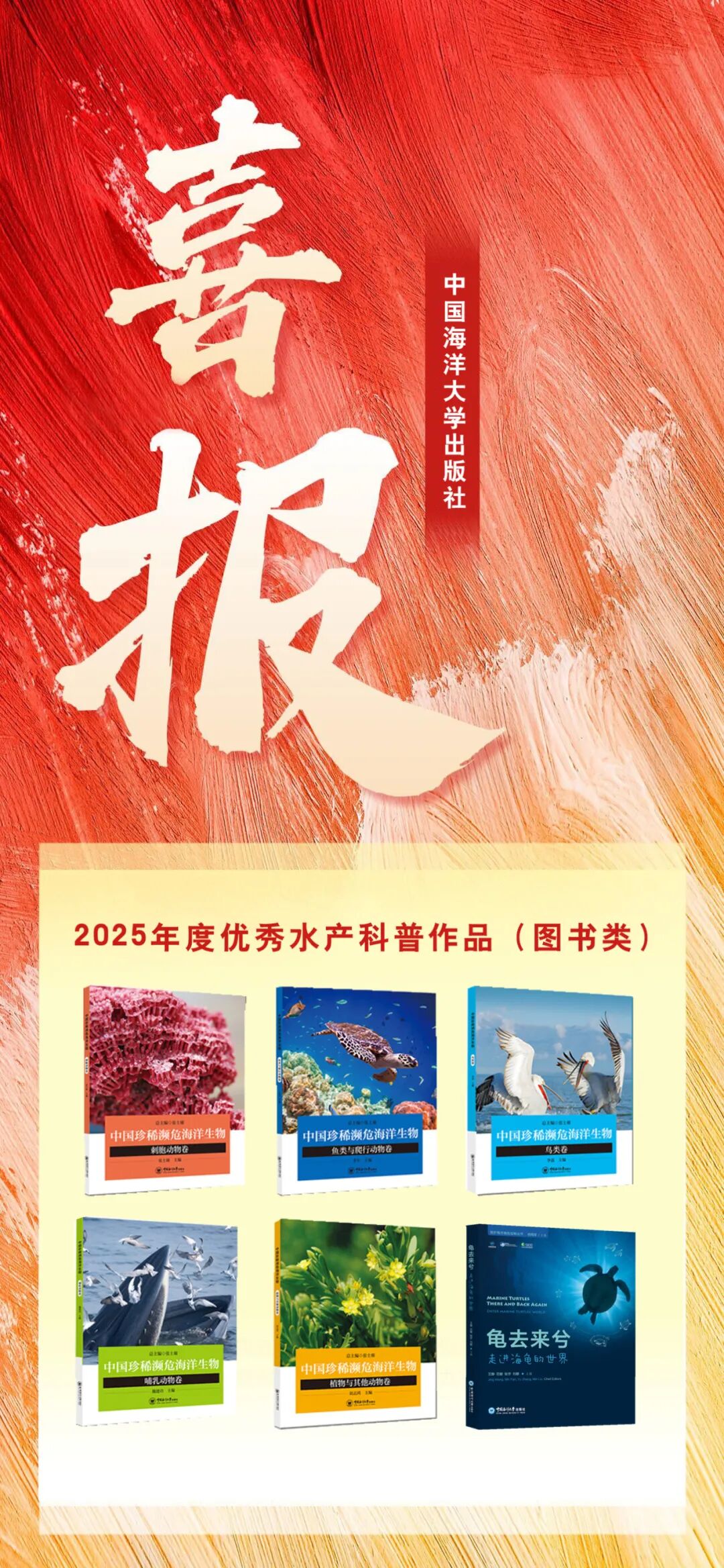 近日,由中国水产学会组织开展的“2025 年度优秀水产科普作品征集活动”评选结果揭晓,中国海洋大学出版社出版的“中国珍稀濒危海洋生物”科普丛书(5 册)、《龟去来兮——走进海龟的世界》成功入选。
