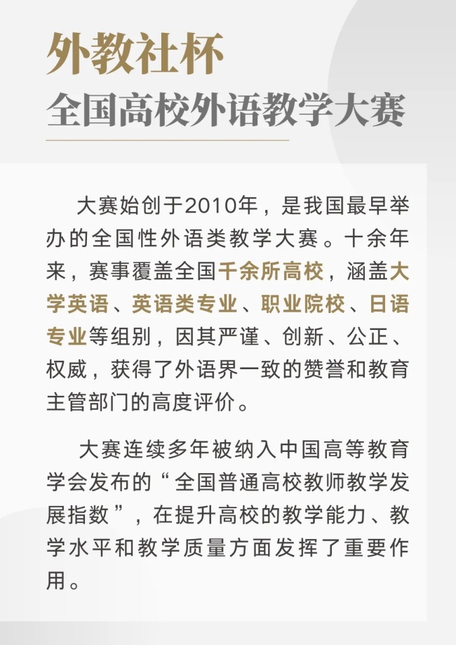 第十六届“外教社杯”全国高校外语教学大赛(大学英语组)以“传播中国、领航未来”为主题。本届大赛自今年3月启动以来,历经全国30个赛区的层层遴选与激烈角逐,最终综合课组、视听说课组共58位外语教学精英崭露头角,齐聚上海,向着巅峰荣誉发起终极冲刺!