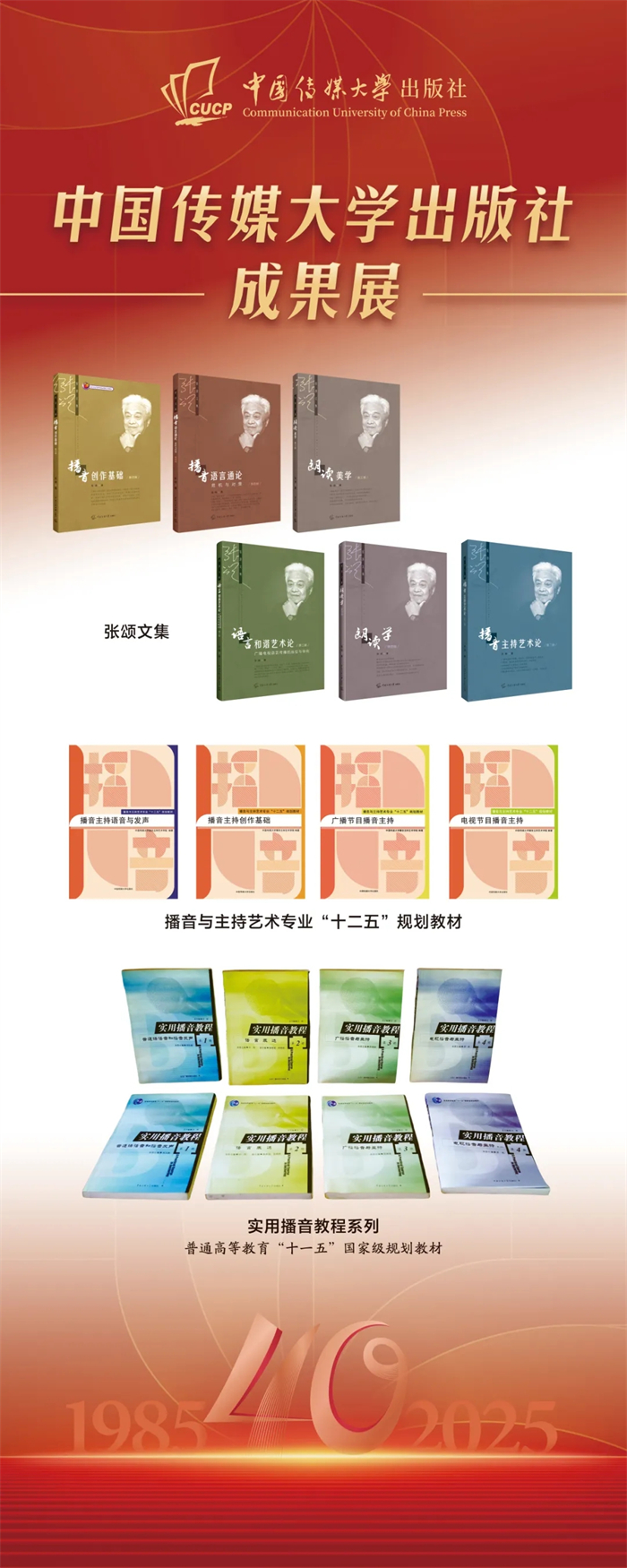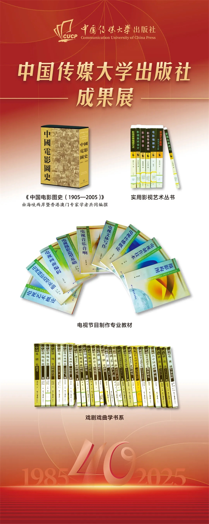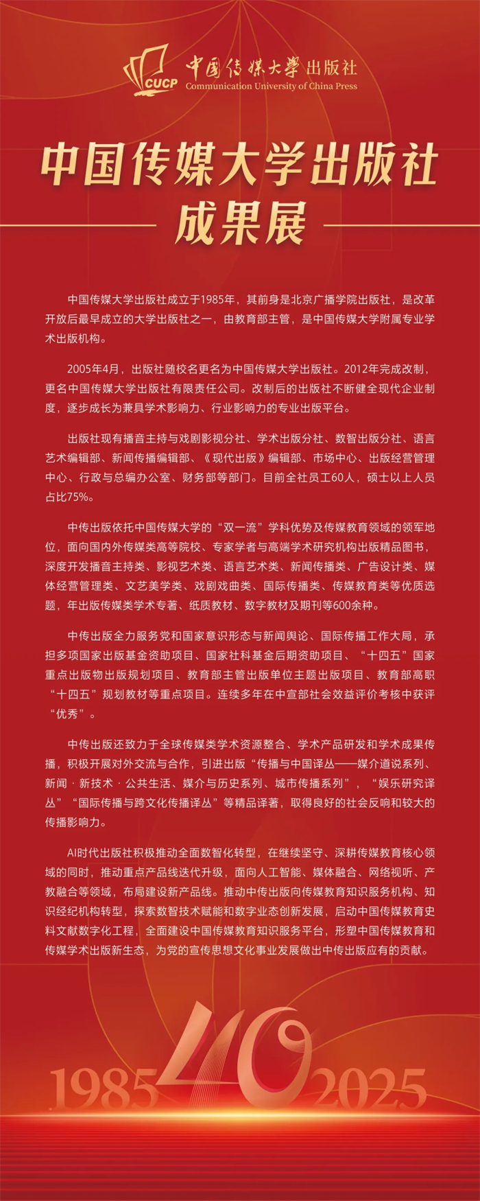 中国传媒大学出版社成果展在本次会议上同步展出。该成果展重点呈现了出版社自建社以来的核心出版成果,涵盖图书、音像制品、学术期刊及融合出版物等品类,系统梳理了出版社在推动学术传播与文化传承中所积淀的出版脉络,受到与会领导与专家的广泛关注与好评,彰显了出版社长期以来坚守品质、深耕内容的出版传统与时代贡献。