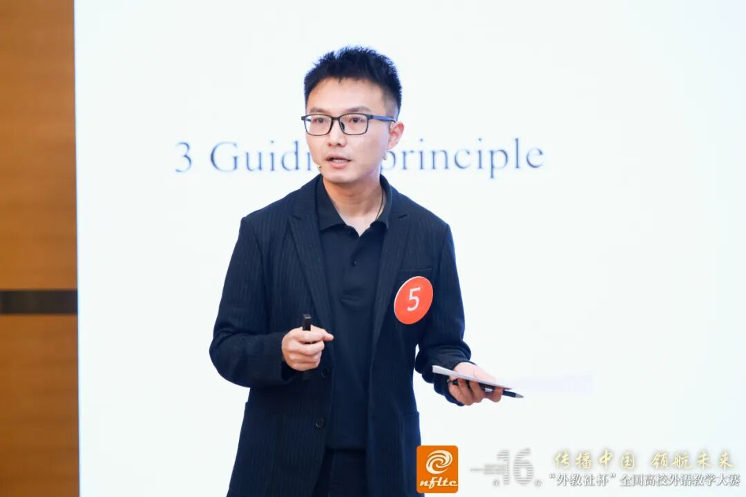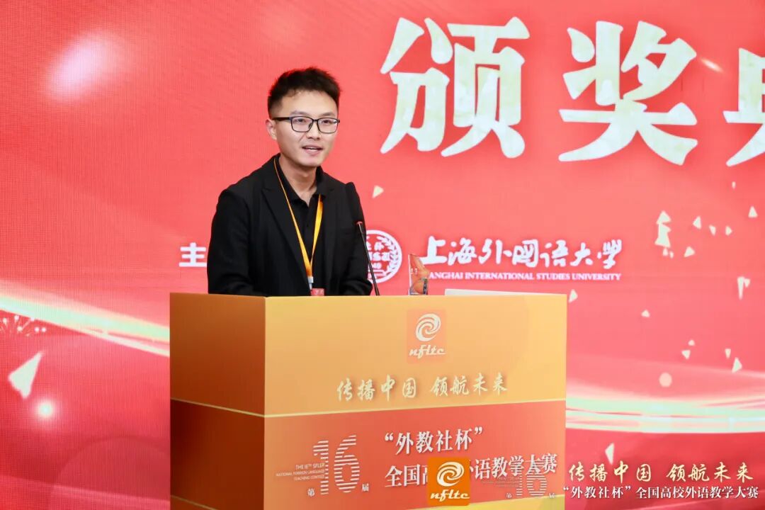 视听说课组特等奖获奖选手四川师范大学何广宇老师发表获奖感言。他感谢大赛组委会的精心筹备和耐心细致的付出,感谢各位评委专家的鼓励和支持,尤其是王海啸教授在点评环节提出的深刻问题,让我对教学理念有了全新的思考维度。他同时表达了对同组参赛选手的敬意,正是这种良性竞争激发了教学创新的火花;也感谢同事朋友们在备赛过程中的陪伴支持,这份温暖成为他不断前行的动力。“这份特等奖荣誉不仅是对过去教学实践的肯定,更是激励我攀登教育高峰的新起点。”何老师表示,他将以此次获奖为契机,持续探索外语教学创新路径,为培养具有国际视野的新时代外语人才贡献力量。