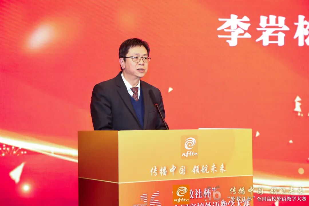 上海外国语大学李岩松校长代表大赛主办方向参赛教师和支持大赛发展的评委专家、工作人员表达了敬意。李岩松校长在致辞中强调,“外教社杯”全国高校外语教学大赛自创办以来,始终将推动高校外语师资队伍建设作为核心使命。随着教育数字化转型的深入推进,大赛与时俱进地创新赛制设计,特别将人工智能辅助教学设计纳入评审体系,这一创新举措有力促进了前沿技术与教学实践的深度融合。李校长表示,大赛不仅是教学技能的竞技场,更是践行“提升中华文明传播力、影响力”使命的重要平台。参赛教师们以精湛的教学技艺展现了新时代外语教师的专业素养,更以赤诚的教育情怀诠释了立德树人的深刻内涵。