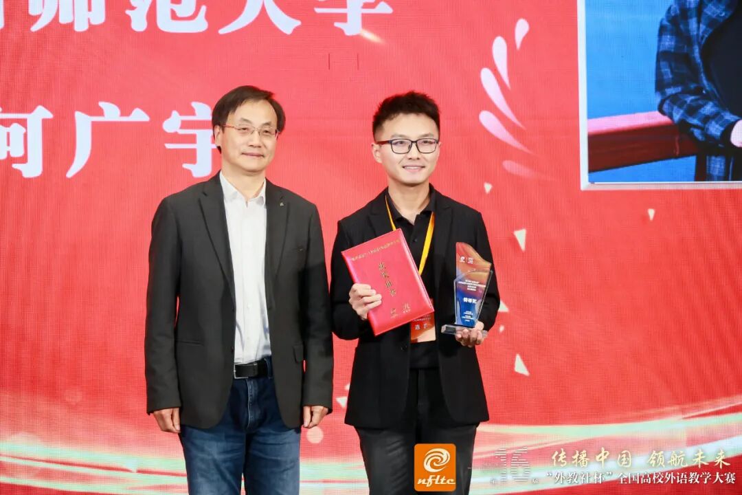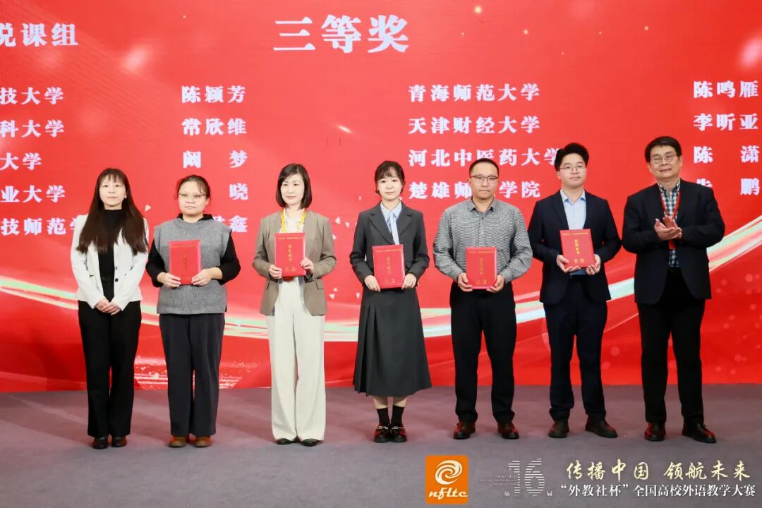 河北师范大学张森教授、上海外语教育出版社副总编辑王一佼为视听说课组三等奖获奖选手颁奖