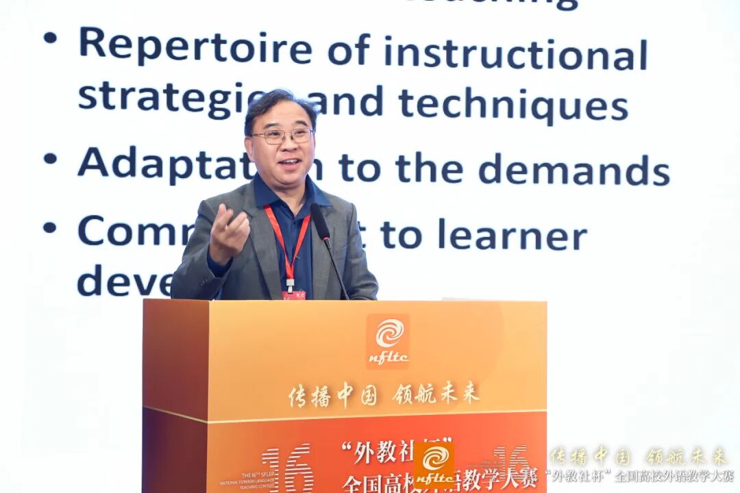 教育部高等学校大学外语教学指导委员会副主任委员、上海外国语大学束定芳教授表示,大赛始终与外语教育改革同频共振,见证着我国高校外语教育质量的稳步提升。当前时代背景下,对照《教育强国建设规划纲要》要求,外语教育工作者肩负着重要的历史使命,本次大赛主题是对于时代发展的有力回应。他表示,外语教育要塑造兼具家国情怀与国际视野的时代新人,并提出三点要求:以立德树人为根,筑牢传播中国的价值根基;以数智为翼,创新教学生态;以素养提升为要,锻造引领发展的教师队伍。