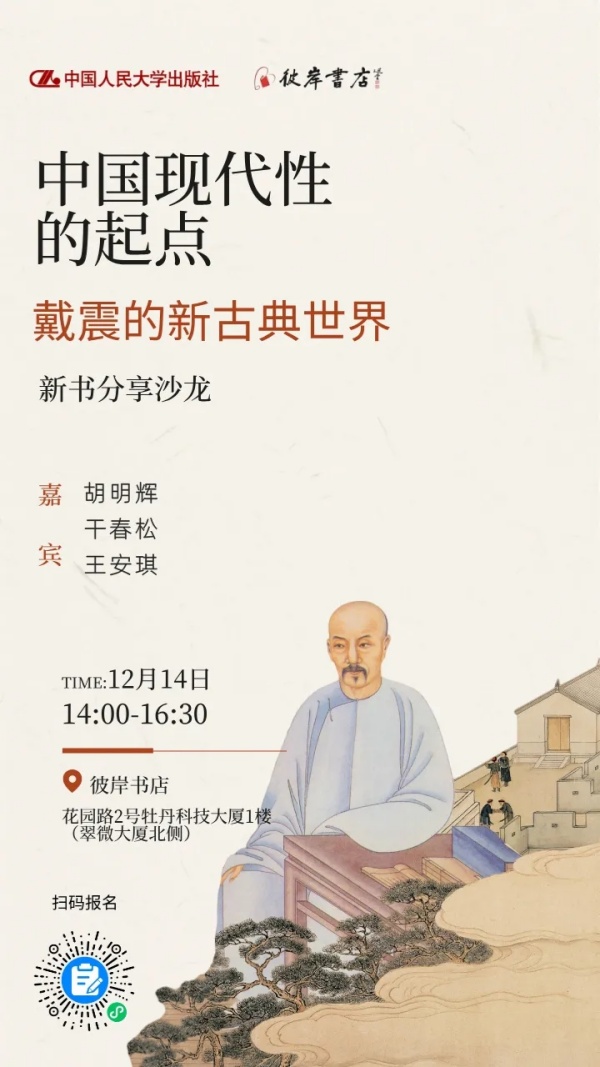 2025年12月14日下午,《中国现代性的起点:戴震的新古典世界》一书作者胡明辉,与南开大学哲学院教授干春松、广东外语外贸大学阐释与国际传播研究院助理研究员王安琪,在北京彼岸书店,一同展开对这本书以及戴震的新古典主义思想的分享。
