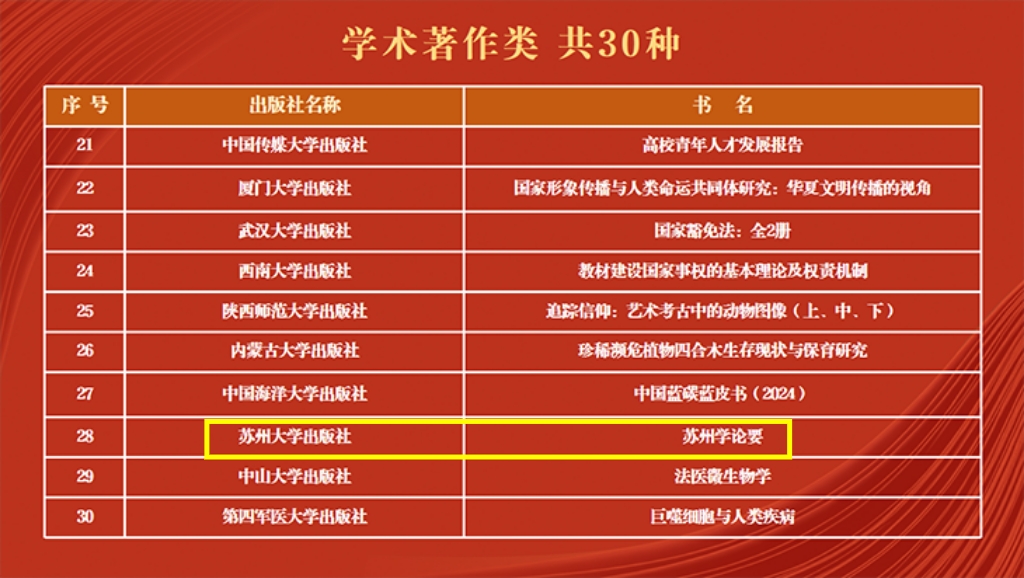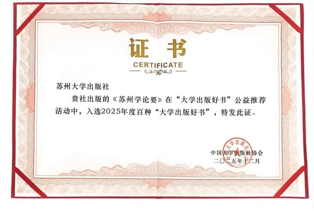 12月13日,中国大学出版社协会2025年年会在杭州举办,会上发布了2025年度百种“大学出版好书”公益推荐入选书目。2025年度百种“大学出版好书”分为主题出版类、高校教材类、学术著作类、大众图书类。苏州大学出版社出版的《苏州学论要》入选(学术著作类)。