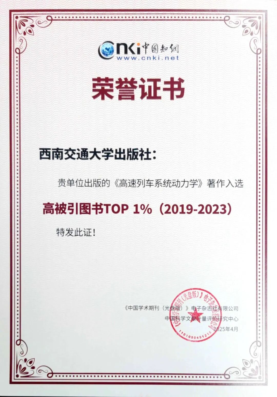 《高速列车系统动力学》一书凭借卓越的学术价值与广泛社会影响力,继成功入选四川省2018—2019年度重点图书规划项目、四川省“十四五”普通高等教育本科规划教材后,于2025年成功入选中国知网・中国科学文献计量评价研究中心发布的“高被引图书 TOP1%(2019—2023)”榜单,成为交通运输类学术专著中的第五名。