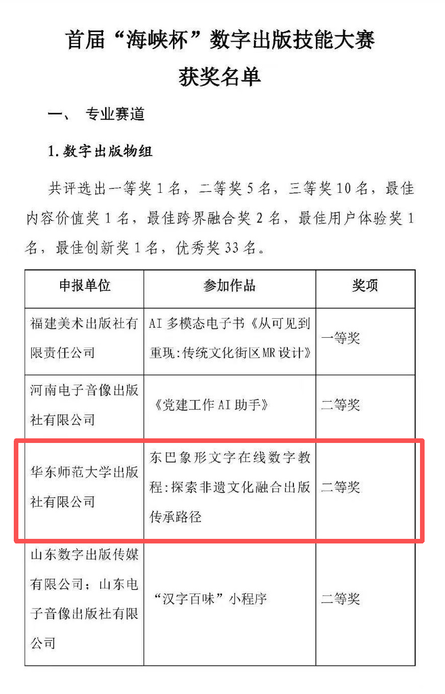 近期,首届“海峡杯”数字出版技能大赛颁奖典礼在福州举行。华东师范大学出版社的参赛作品“东巴象形文字在线数字教程:探索非遗文化融合出版传承路径”荣获专业赛道二等奖。