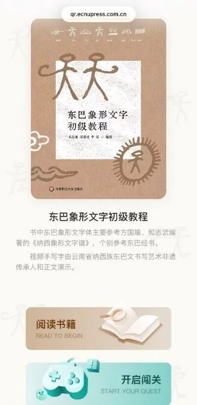 在《东巴象形文字初级教程》纸书的基础上,华东师范大学出版社打造了一款面向社会大众的东巴象形文字在线数字教程,旨在促进纳西族东巴象形文字的保护与传承。该产品精选近200个基础东巴文字,采用东巴象形文字、汉语、纳西拼音三者对照,从识字、单句、纳西拼音、词语拼读、书写、知识拓展等方面,通过音视频和游戏带领用户理解每个东巴文字的构成、读音、书写规范及其应用场景。