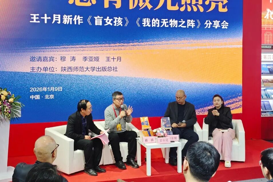 2026年1月9日上午,由陕西师范大学出版总社主办的总有微光照亮——王十月新作《盲女孩》《我的无物之阵》分享会在2026北京图书订货会举行。西安市作家协会主席穆涛,《十月》杂志主编季亚娅及两部书作者、广东省作家协会副主席、《作品》杂志社社长王十月等出席活动。分享会由陕西师大出版总社大众文化出版中心主任刘定主持。