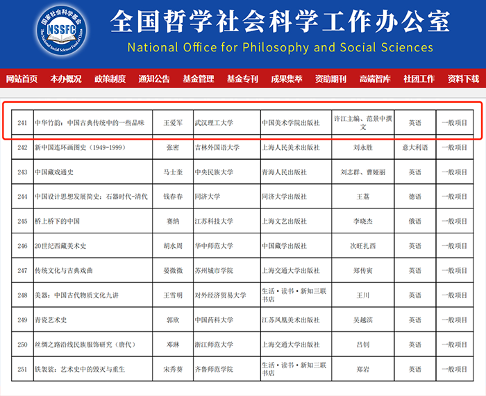 近日,全国哲学社会科学工作办公室发布了2025年《国家社科基金中华学术外译项目立项名单》,共有255个项目成功立项。中国美术学院出版社《中华竹韵:中国古典传统中的一些品味》入选。