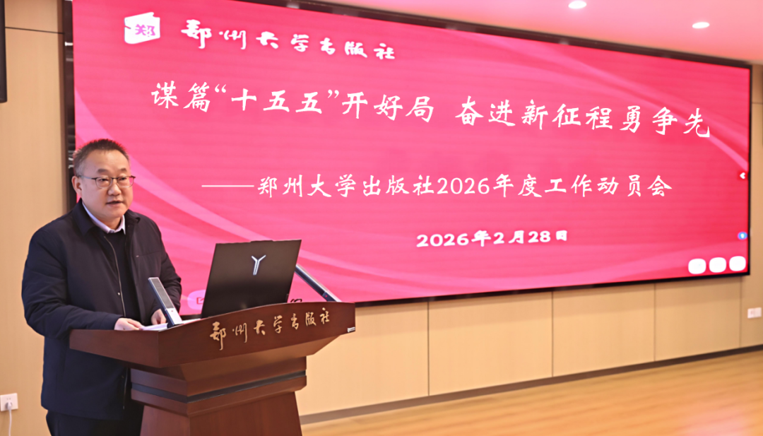 春潮涌动,奋进正当时。为进一步理清发展思路、压实责任目标,推动出版社高质量发展迈向新台阶,近日,郑州大学出版社召开2026年度工作动员会。郑州大学党委常委、宣传部部长、郑州大学出版社总编辑孙保营,出版社党委书记杨雪冰,党委副书记、纪委书记李果,党委副书记、副社长吴昕,副总编辑、期刊中心副主任赵秋民、凌青出席会议。郑州大学出版社全体员工参加会议。会议由郑州大学出版社社长、期刊中心主任卢纪富主持。