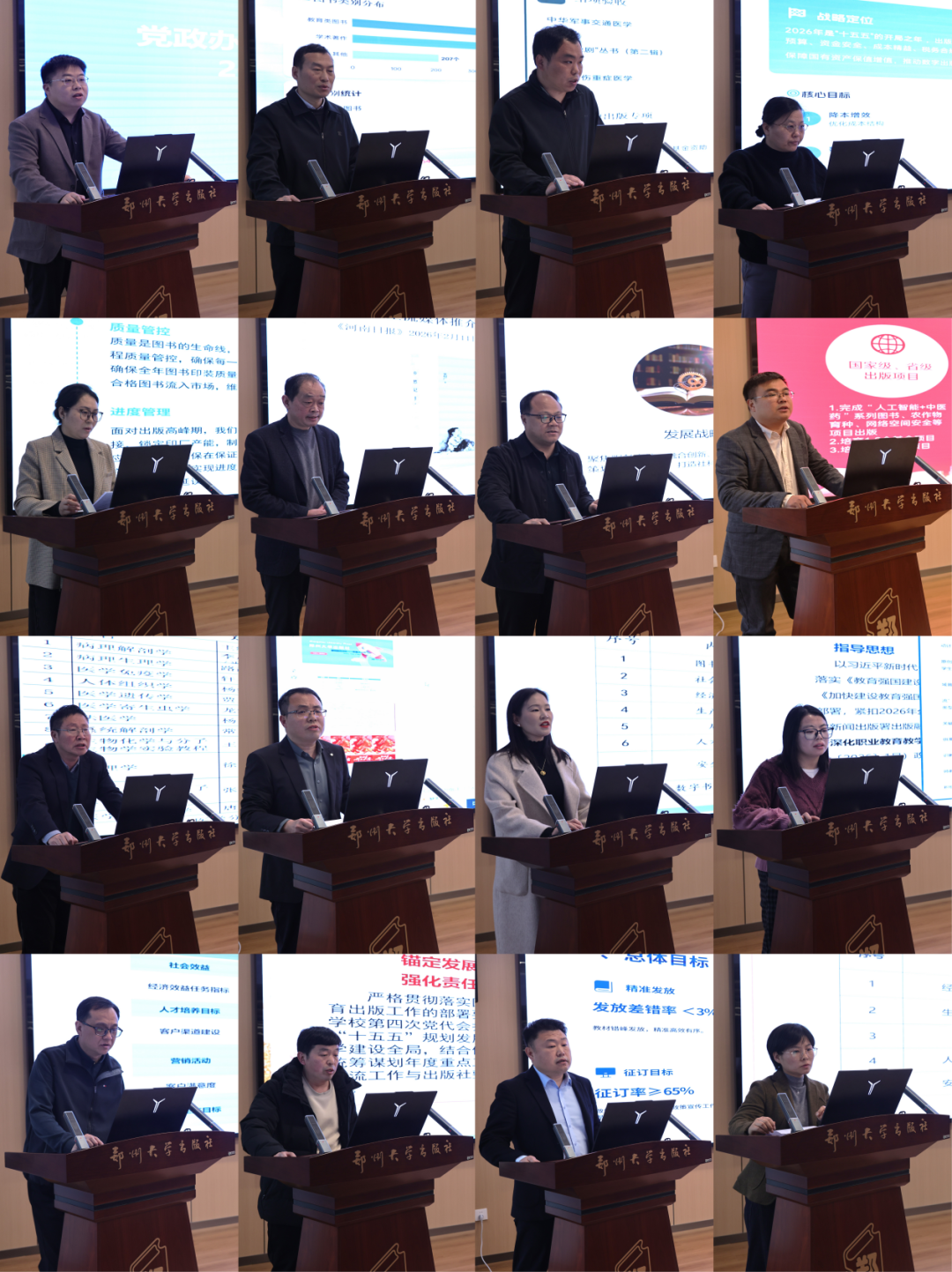 会上,郑州大学出版社16个部门和分社负责人依次上台汇报2026年重点工作计划。各位代表立足本部职责、紧扣发展大局,围绕行政管理、选题策划、数字转型、营销发行等核心工作,分享了重点工作计划与攻坚举措,展现出务实担当的工作作风与奋勇争先的精神风貌,为出版社全年工作开展凝聚了共识与力量。