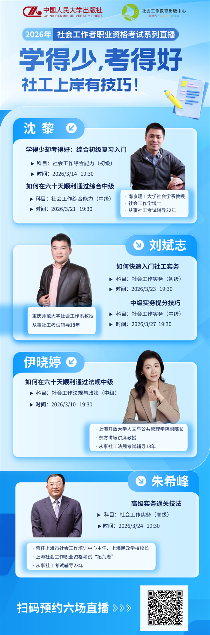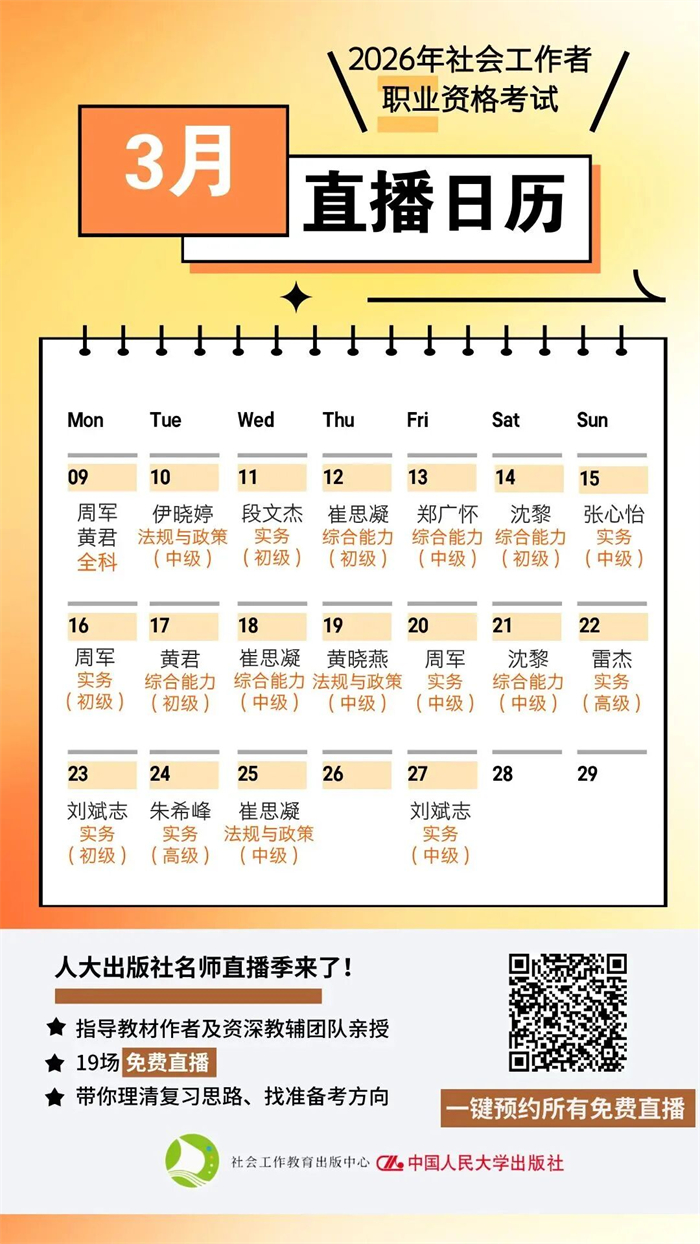 2026年社会工作者考试报名已于今日正式启动!3月9日起,人大社特邀指导教材作者及资深教辅团队,推出19场免费直播,带你理清复习思路、找准备考方向。干货满满,机会难得。快来扫描上方二维码,一键预约所有场次。(后附各省报名时间,千万别错过!)