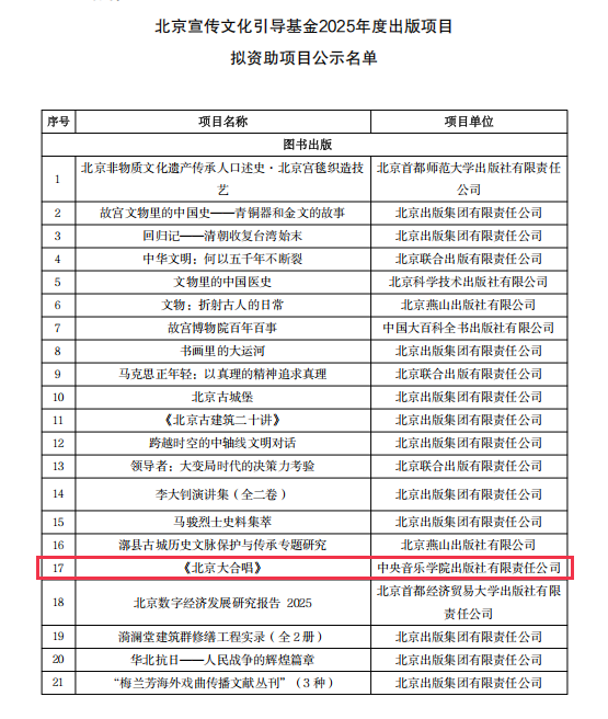 近日,北京宣传文化引导基金2025年度出版项目拟资助名单公示,中央音乐学院出版社申报的《北京大合唱》(孟卫东、唐建平作曲,邹静之作词)项目成功入选图书出版类资助名单。