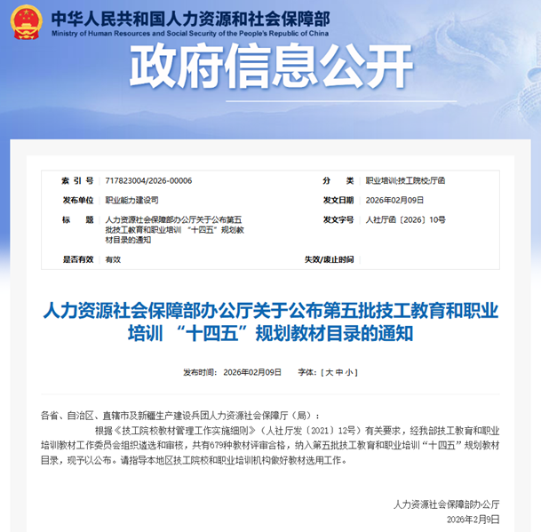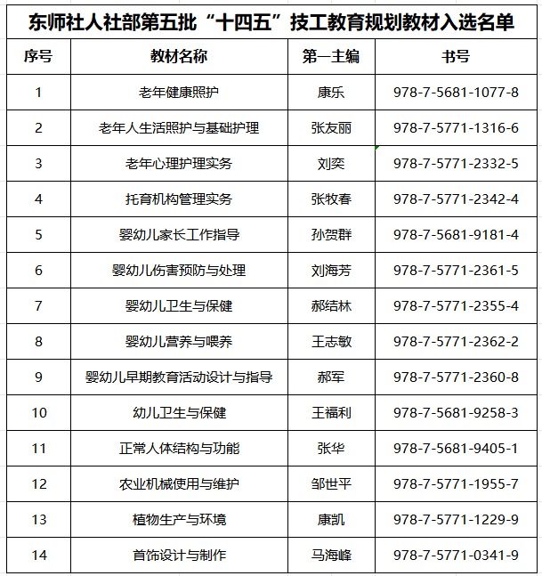 近日,人社部官网发布了《人力资源社会保障部办公厅关于公布第五批技工教育和职业培训“十四五”规划教材目录的通知》。经评审,东北师范大学出版社共有14种教材入选该目录。入选教材内容覆盖多个领域,包括学前教育、家政养老、农林牧渔以及艺术设计等方向,旨在为职业院校师生提供系统且紧跟行业发展的教学资源,助力我国技能人才队伍的建设和高质量发展。