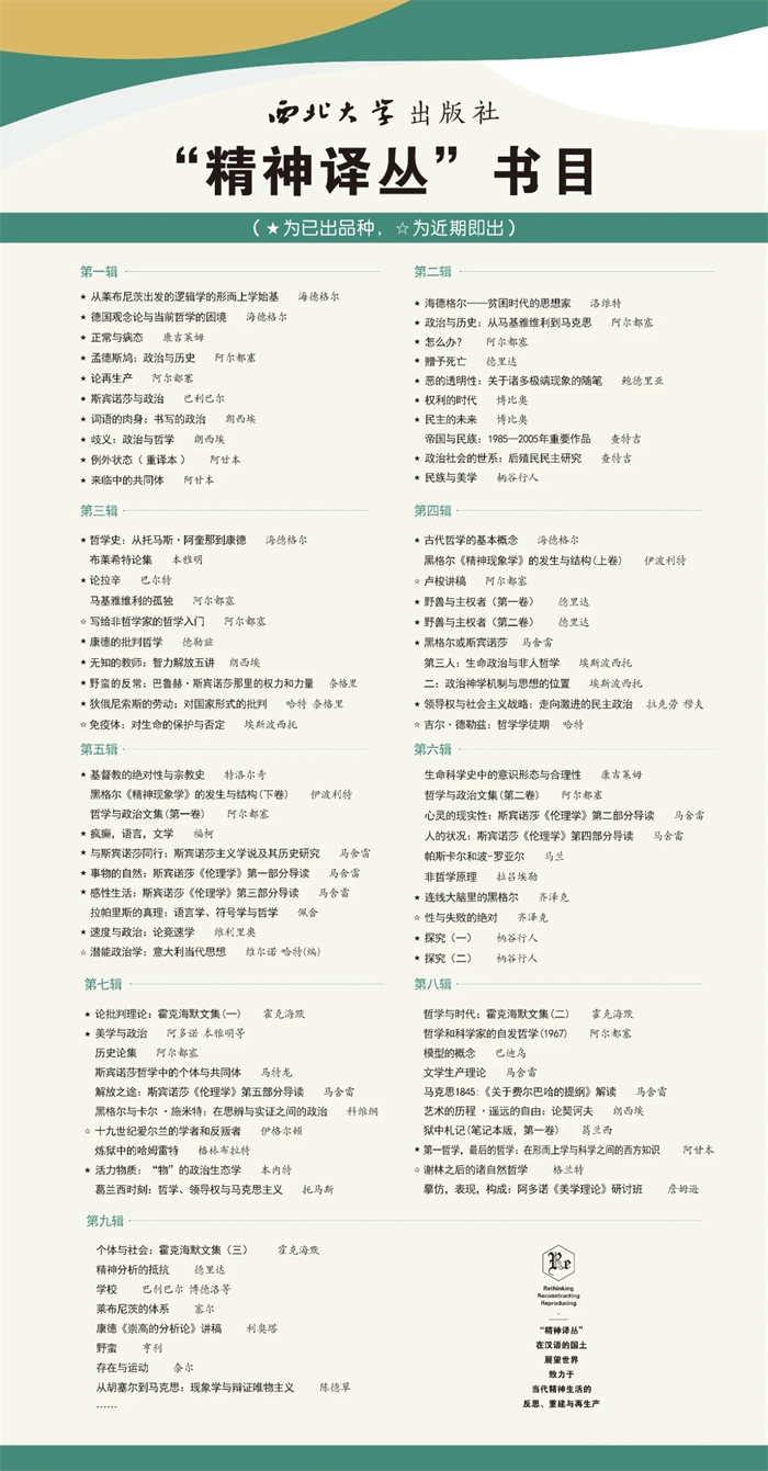 2015年,“精神译丛”开始将这股“新斯宾诺莎主义”的西方思潮引入中国,推动中国学界由“唯心论”和“泛神论”的传统解读转向对斯宾诺莎的当代重构:马克思主义研究界跳出黑格尔传统,“重新发现”了斯宾诺莎的唯物主义;当代儒学从斯宾诺莎的“实体一元论”发现了重建中国哲学“体用不二”学说的西方哲学资源;左翼学者则从中发现了新的主体理论以及大众民主和资本主义批判的思想潜能。在当代中国哲学界的探索者那里,有人高度肯定斯宾诺莎在后康德哲学、后主体性哲学语境中的范式意义;也有人将这波思潮批评为“斯宾诺莎的幽灵”。
