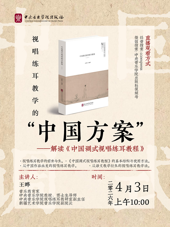 锁定中央音乐学院出版社直播间,跟着王晔教授了解视唱练耳教学的“中国方案”,抢限量亲签版新书,开启中国调式音乐学习新旅程。