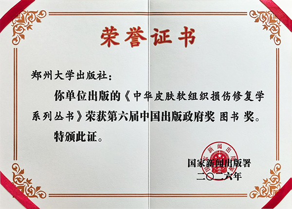 郑州大学出版社获奖的《中华皮肤软组织损伤修复学系列丛书》是“十四五”国家重点图书出版规划项目和2022年度国家出版基金资助项目图书。孙保营、杨雪冰担任项目负责人,李振川、薛晗、张锦森等担任责任编辑,中国工程院院士、美国国家工程院外籍院士付小兵教授领衔总主编。这是郑州大学出版社继2021年荣获第五届中国出版政府奖后,时隔四年再次荣获该奖项,也是连续获得第五届、第六届中国出版政府奖图书奖的3家高校出版社之一,充分彰显了郑州大学出版社在学术出版领域的持续深耕与精品战略成效。