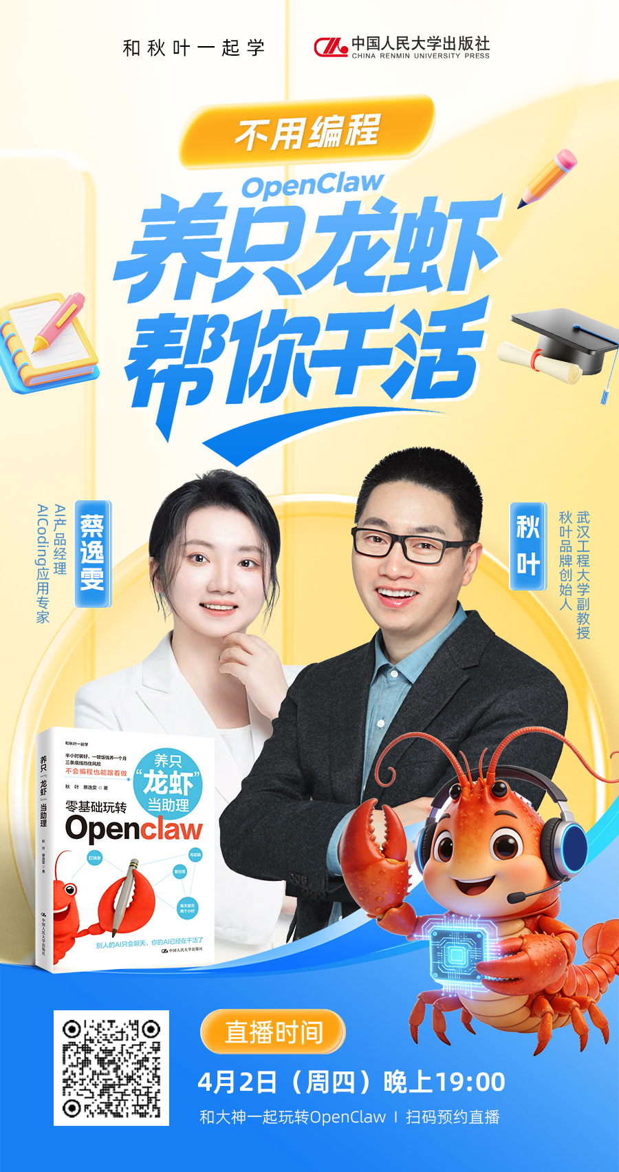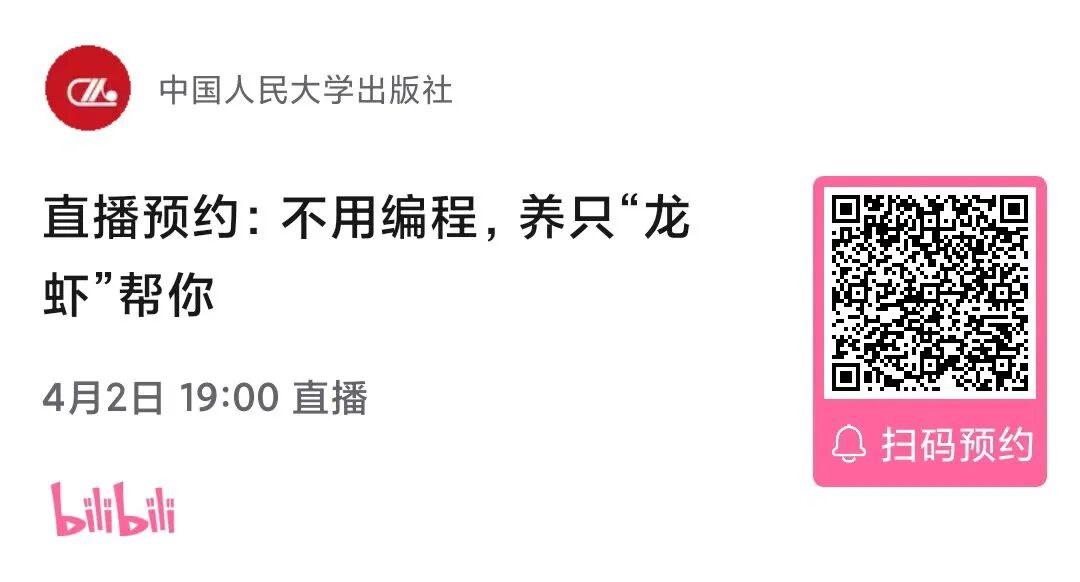 同时,中国人民大学出版社也邀请到了本书作者秋叶老师与蔡逸雯老师共同做客直播间,为全球读者拆解如何不用编程就能养只“龙虾”助理帮你干活。直播时间为2026年4月2日晚7点,欢迎大家预约直播,与秋叶老师线上互动!