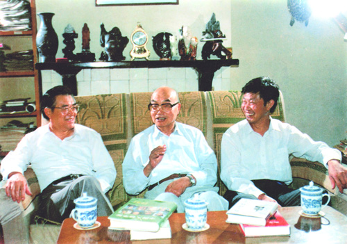 1992年国庆期间,南京大学曲钦岳校长(左)、党委书记韩星臣同志(右)看望匡老(中),表示南京大学将全力以赴,支持《评传丛书》的编撰出版工作。