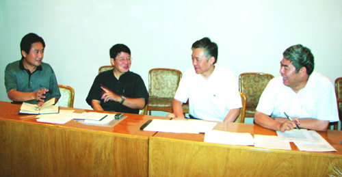 南京大学党委书记洪银兴(右一)、副校长张异宾(右二)、校长助理周宪(右三)在研究、部署《评传丛书》的撰著出版工作。