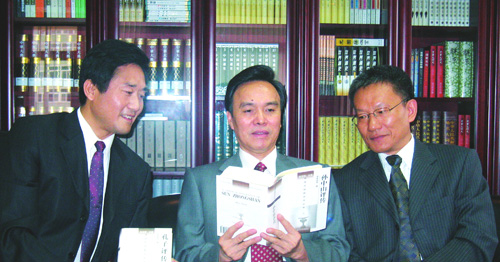 国家新闻出版总署龙新民署长(中)、邬书林副署长(右)听取南京大学出版社关于《评传丛书》编辑出版工作的汇报。