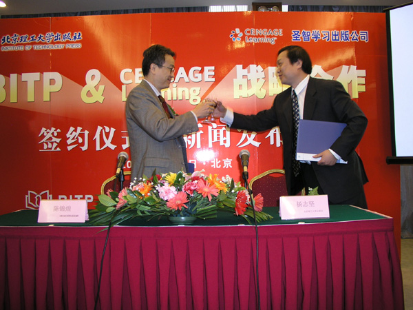2008年3月28日,北京理工大学出版社与圣智学习出版公司(Cengage Learning,原汤姆森学习出版集团)在北京举行了战略合作意向书的签约仪式。北京理工大学出版社正式成为圣智学习出版公司在中国职业教育出版领域的重要战略合作伙伴。双方将就高等职业技术教育等领域的图书出版展开合作。Cengage Learning将向北京理工大学出版社优先提供最优秀的工程技术等类别的职业技术教育产品,对促进我国出版业和职业教育的国际化进程将起到积极的助推作用。