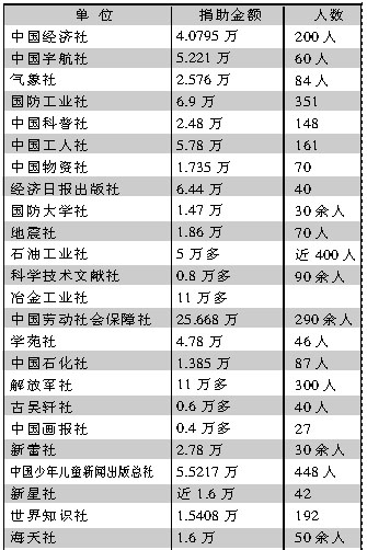 说明:本次统计截至5月19日20时;排序以调查反馈时间先后为准;捐助金额以元为单位;“追加”额度指出版发行单位5月15日20时至5月19日20时新增捐助;未标注“追加”的单位与上期统计无重合;大学版协捐助统计均为各社以单位名义捐款;部分出版集团的捐助额包含发行集团;部分出版发行单位捐助款为员工个人捐助,还有一部分为单位和员工累计捐款;一些出版发行单位捐款尚在统计中。(相关链接:《书业爱心捐助紧急大行动》)