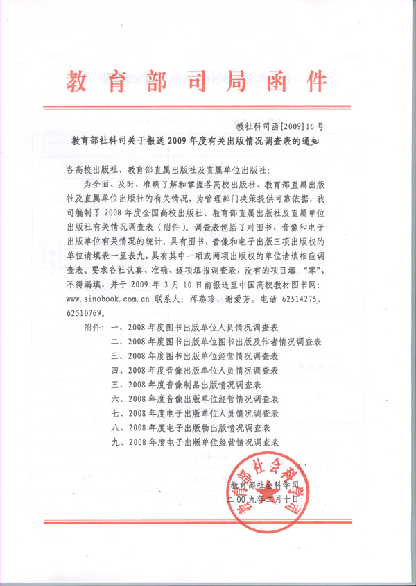 教育部社科司关于报送2009年度有关出版情况调查表的通知 - 信息公告 - 中国高校教材图书网