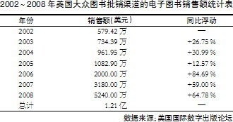 据国际数字出版论坛(IPDF)的统计,美国2008年通过批销渠道销售的大众类电子书的销售额达5240万美元,由于其中的折扣现象,零售数字可能是这个数字的两倍,而且这个数据并不包括图书馆、教育或专业领域的电子图书销售(如表所示)。