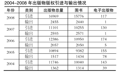 一直以来,困扰国内出版业的版权贸易和图书进出口贸易逆差在2008年依然没有明显改观。2008年,中国大陆出版物版权引进与输出比为7:1,中国大陆出版物的出口贸易额仅相当于大陆销售额的0.5%,不到4000万美元,但进口额为2.86亿美元。作为世界图书出口第一大国的美国,去年出口额为21.9亿美元,德国、法国、日本也各有约数亿美元的出口额。长期以来挥之不去的版权贸易和图书进出口贸易出现大幅逆差,说明我国从出版大国向出版强国迈进的道路依然艰辛曲折,出版业“走出去”依然任重而道远。