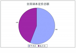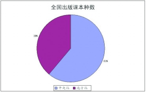 在教材种类数量上,中央社占主导地位,即61%的教材种类由中央社出版;在课本印张数量上,中央社与地方社几乎平分秋色,其比例分别为52%、48%;将教材码洋与教材种类数分布情况比较可以看出,中央社尽管在码洋上占居了一定的优势,但是这种优势似乎在减弱,地方社利用占全国教材种类数39%的基础创造了占全国教材码洋数44%的业绩。